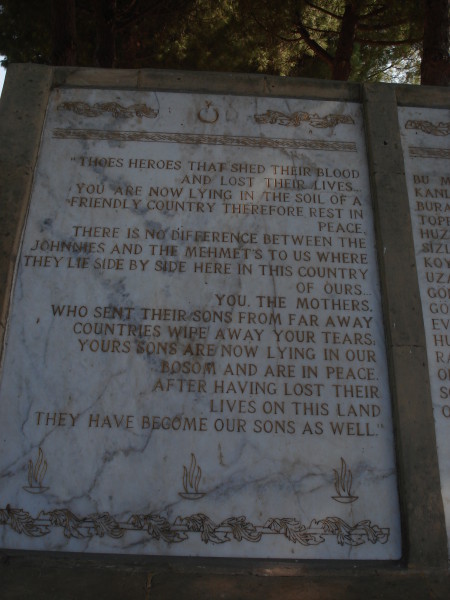In der Schlacht um Gallipoli während des ersten Weltkriegs sind zwischen dem 19.2.15 und 9.1.16 annähernd 250.000 Menschen verletzt worden oder gestorben. Es war der brutalste und blutigste Angriff des ersten Weltkriegs. Die Türkei hatte nach dem Krim Feldzug ein Militärabkommen mit Deutschland, versuchte während des Kriegs neutral zu bleiben, hat sich aber dann ab 1914 den Mittelmächten angeschlossenn, nachdem die Briten zwei bestellte und bereits bezahlte Schlachtschiffe konfiszierten. Unter dem Oberbefehl von Liman von Sanders, haben die Türken, unter dem Befehl von Mustafa Kemal Pascha (dem Gründer der modernen Türkei- Atatürk) tapfer gegen eine Übermacht von Briten, Franzosen und Austalieren gekämpft und die Halbinsel und die Meerenge zum schwarzen Meer erfolgreich verteidigt. Der 18. März ist bis heute ein Feiertag in der Türkei und die Australier "Anzac" ehren in jedem Jahr ihre Verstorbenen auf dem Heldenfriedhof.